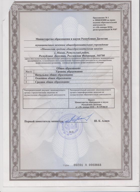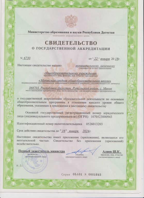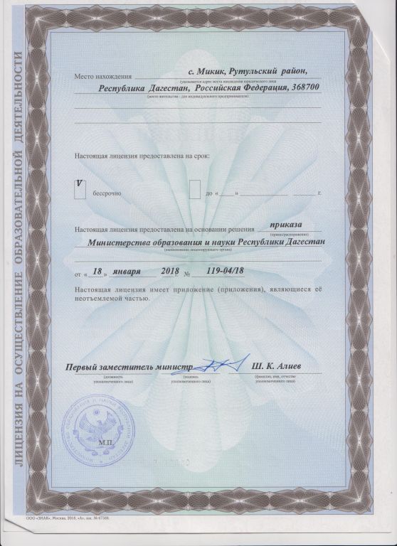 | Адрес местонахождения образовательной организации* | 368700, республика Дагестан, Рутульский район, село Микик |