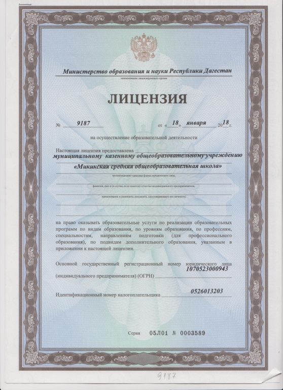 | Полное наименование образовательной организации* | Муниципальное казенное общеобразовательное учреждение «Микикская средняя общеобразовательная школа» |